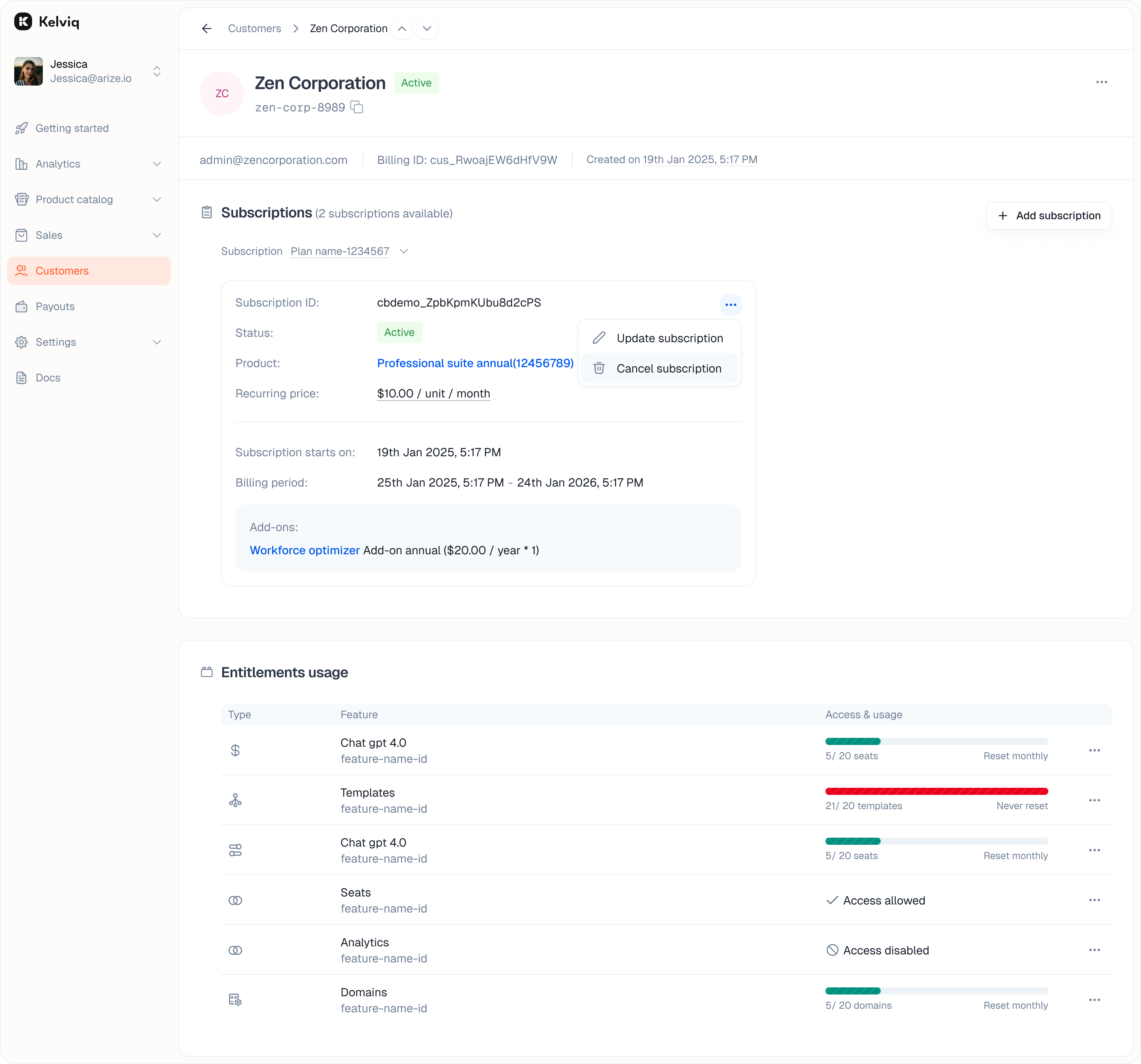 This section lists active and past plans. It shows the status, such as Active or Canceled, and the relevant dates. Add a subscription You can manually subscribe a customer to a plan from here.