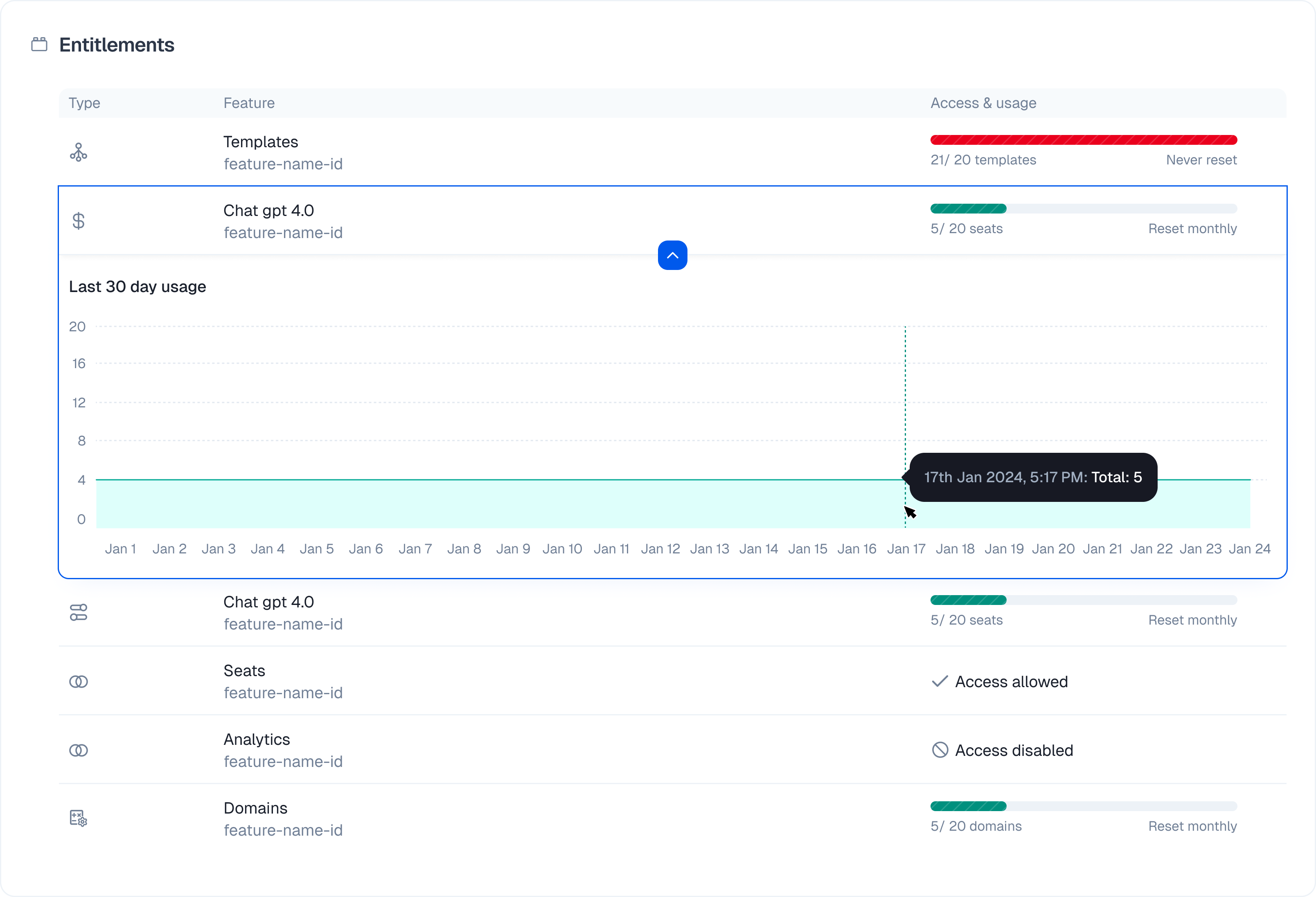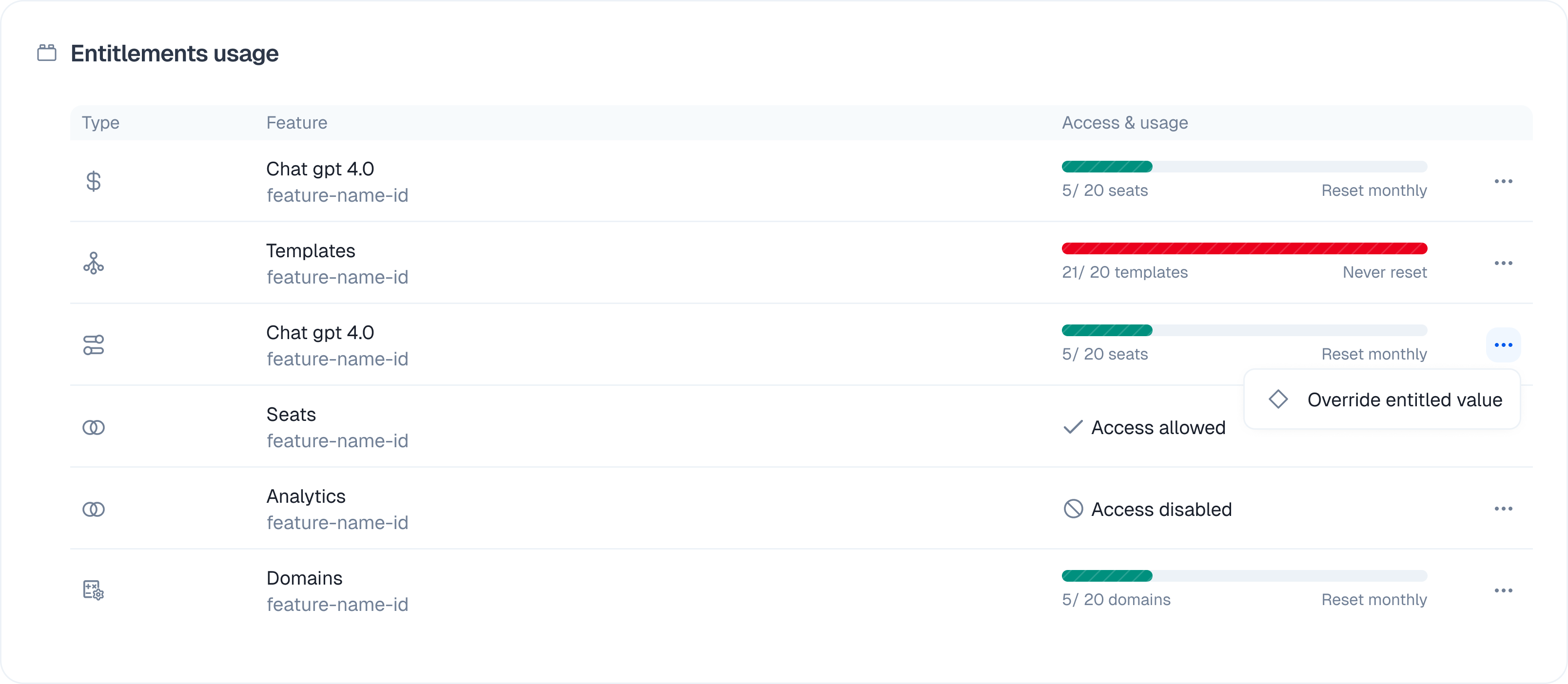 This view shows exactly what the customer can do right now based on their plan. Overrides You often need to make exceptions for specific users. You can do that here without changing the underlying plan.- Change the value of a specific feature.