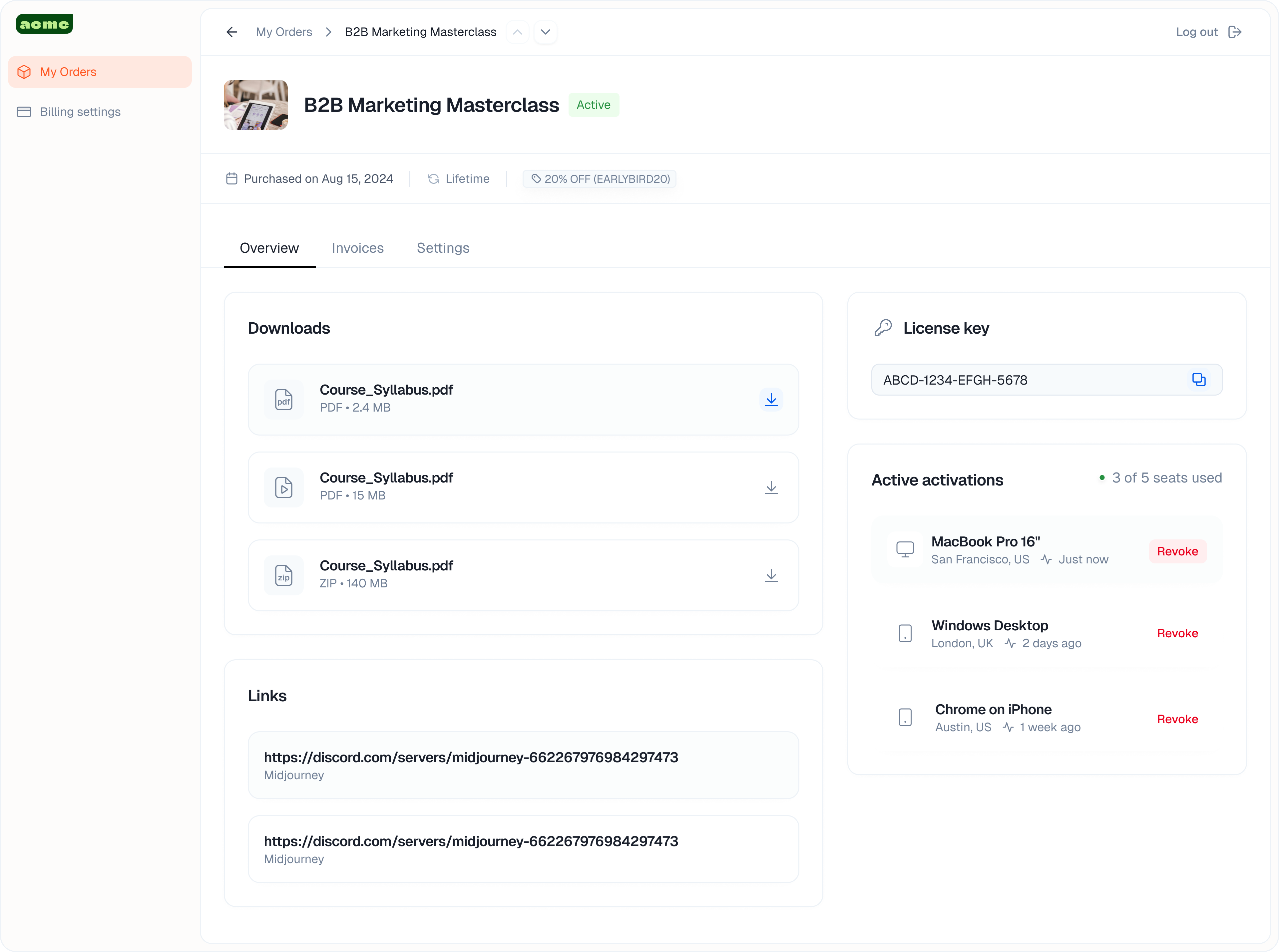 - License management View license keys. If you enforce seat limits, customers can see active devices and revoke licenses to free up seats for new team members.