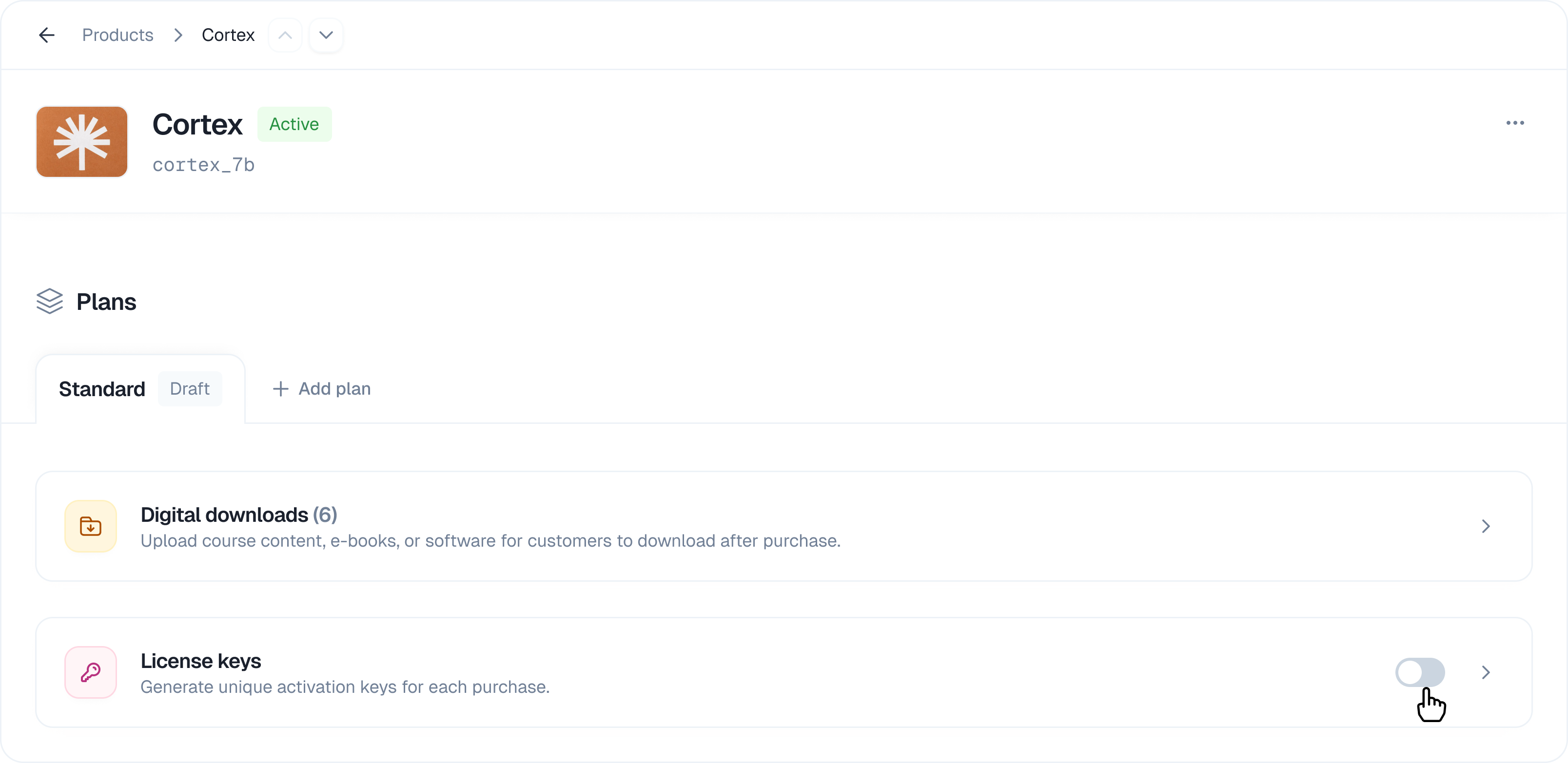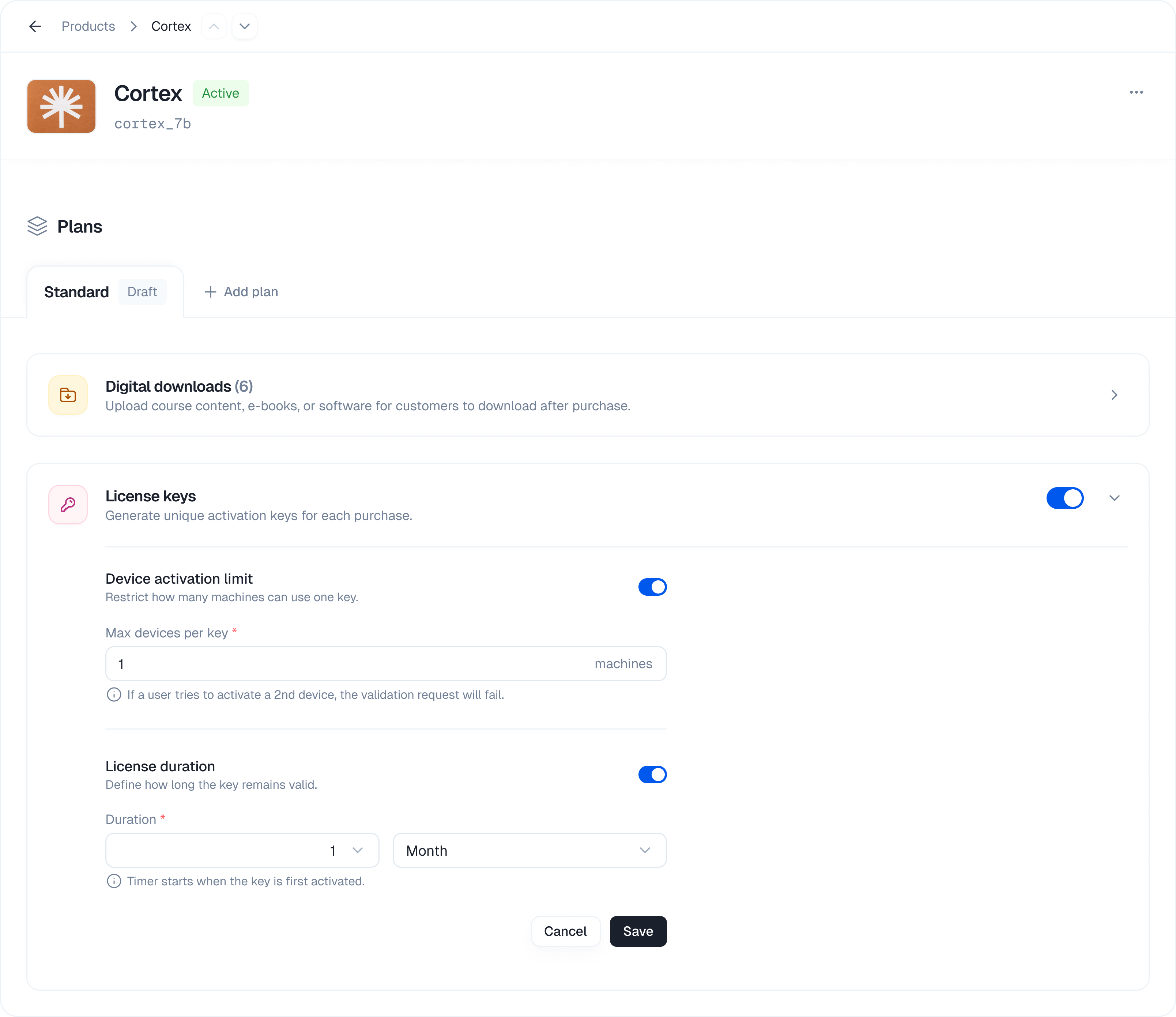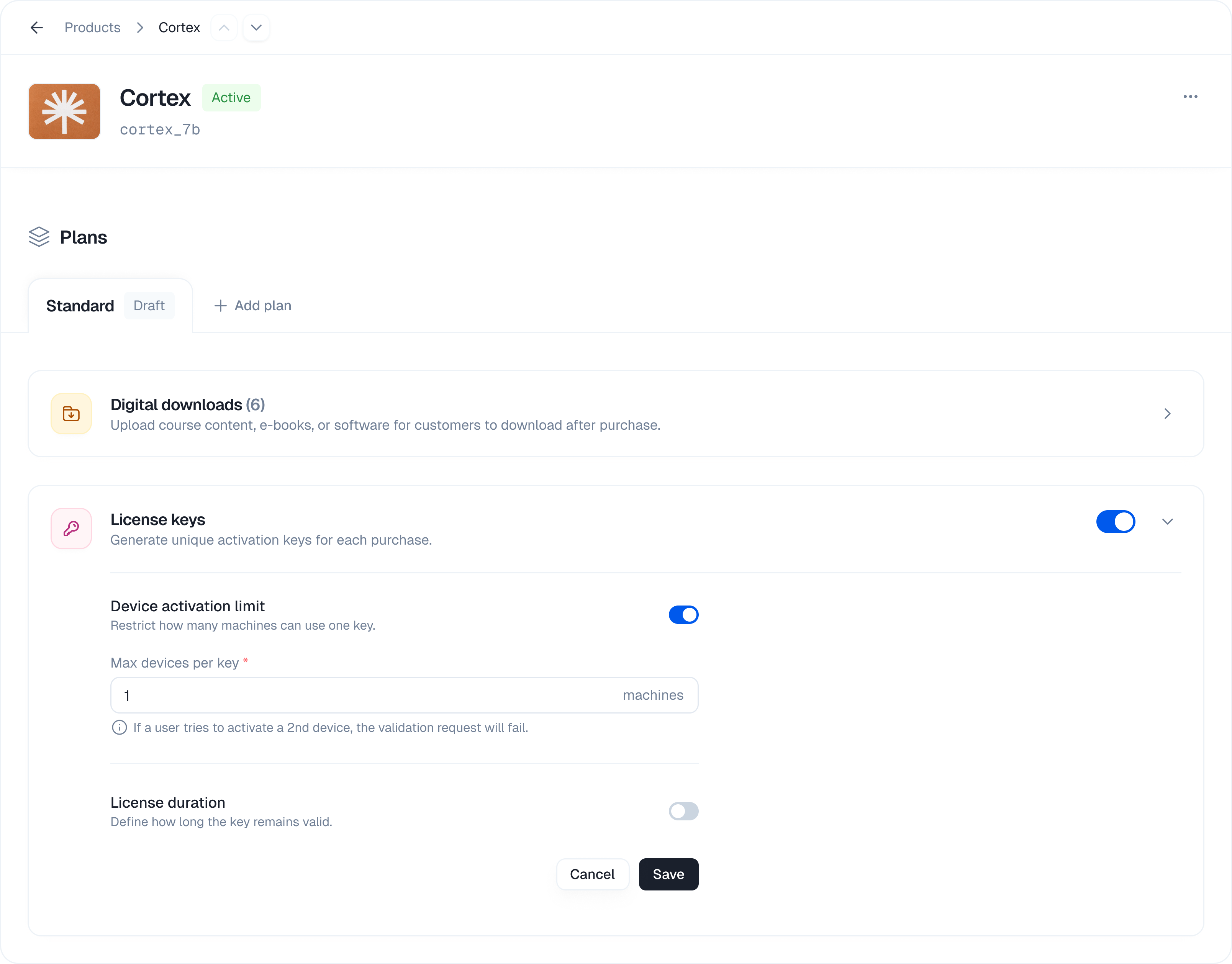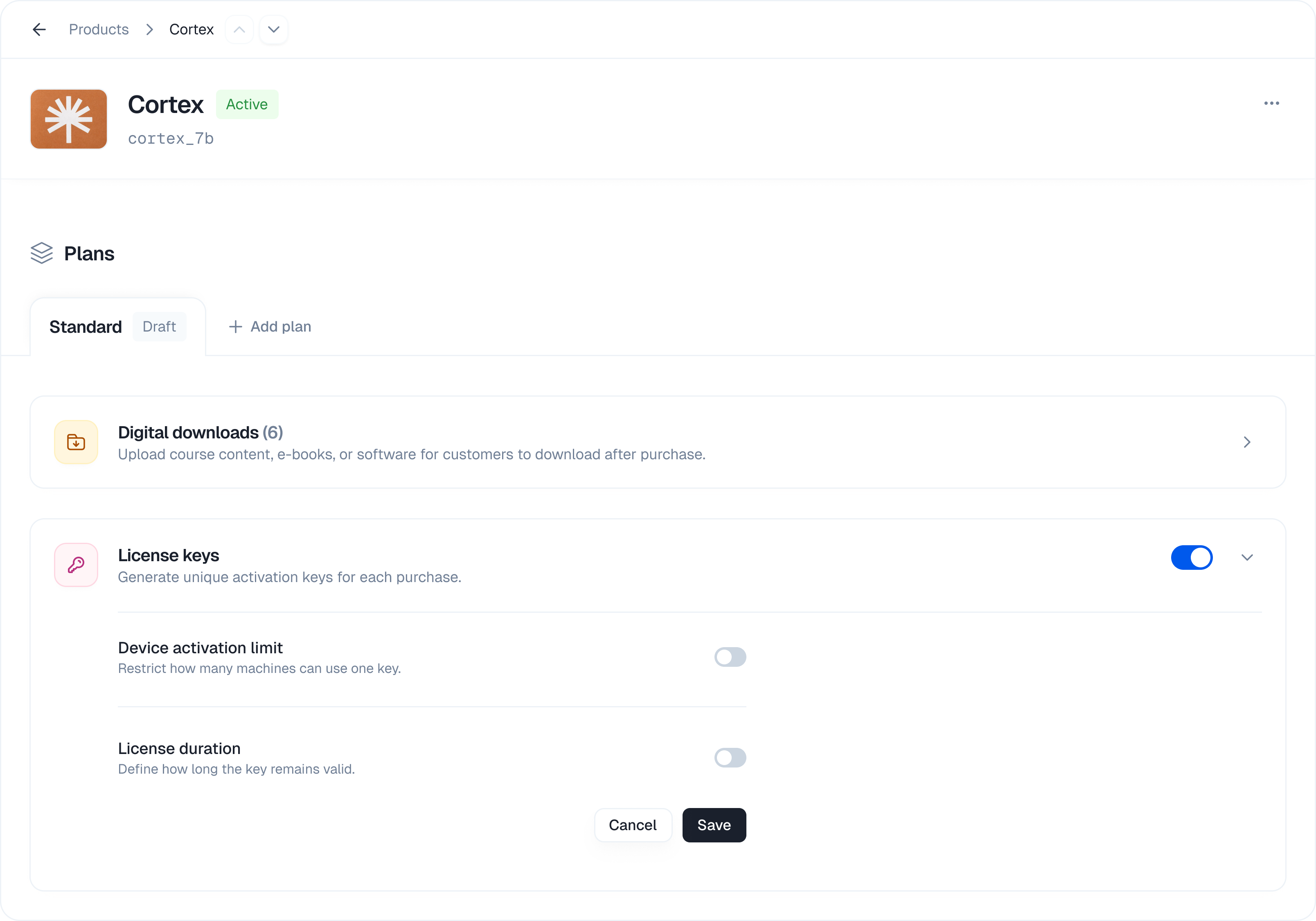 | Enable licenses for a plan | Plan Details | Toggle “License keys” switch |